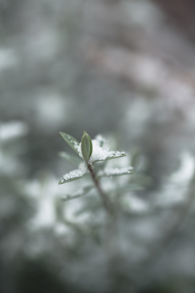 Avevo intenzione di mettere in evidenza la brina sopra a quelle giovani foglie, senza mettere a fuoco tutto quello che stava intorno e… l’esperimento è riuscito. E’ come voler dimostrare il desiderio di rimanere in vita a tutti i costi, nonostante il freddo, nonostante il ghiaccio.