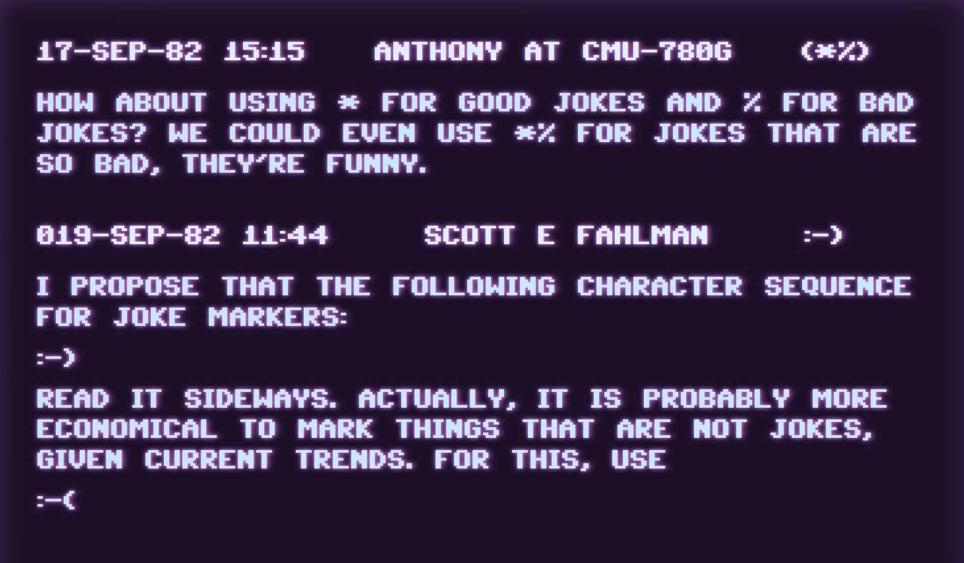 L’immagine postata mostra il primo utilizzo registrato di uno smiley su Internet risale al 1982, quando l’informatico Scott Fahlman propose l’uso di :-) e :-( per distinguere tra battute e post seri online. La proposta arrivò in risposta a un post su nella bacheca della Carnegie Mellon University, dove uno studente scherzò dicendo che c’era stata una fuoriuscita di mercurio nell’ascensore del dipartimento di fisica. Altri studenti non colsero il contesto per lo scherzo e pensarono che la fuoriuscita fosse realmente avvenuta. Gli emoticon furono lentamente adottati in tutta la Carnegie Mellon e successivamente in un pubblico più ampio di Internet.