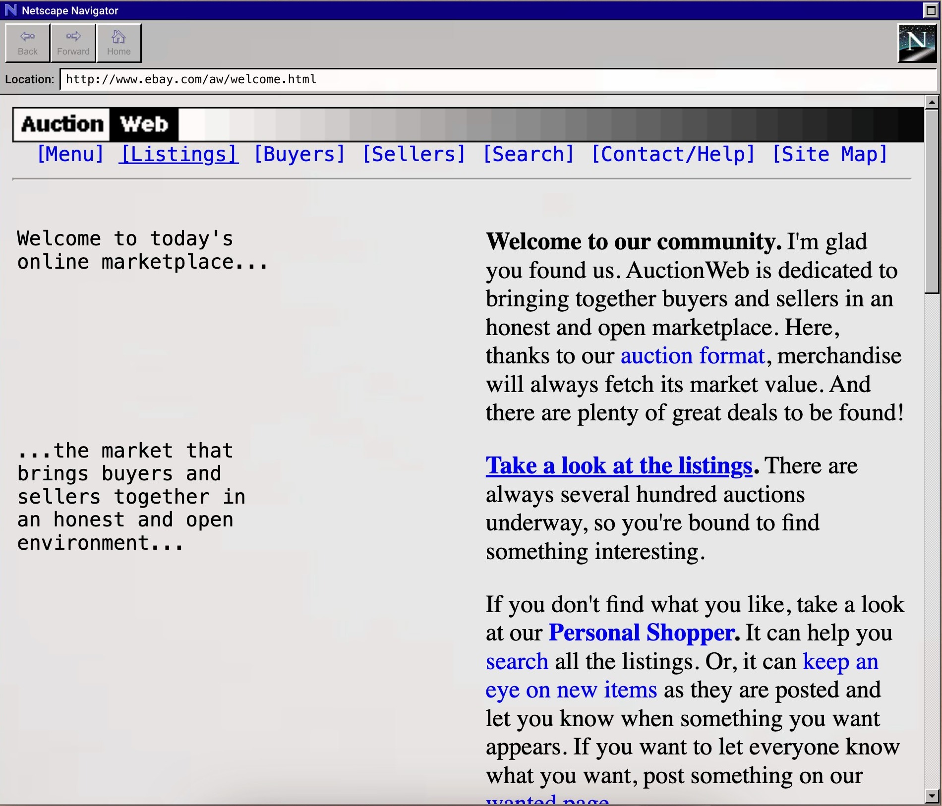 Creata dal 28enne Pierre Omidyar, AuctionWeb era una delle prime piattaforme di e-commerce che consentiva alle persone di elencare gli articoli in vendita al miglior offerente. Omidyar voleva creare una piattaforma che permettesse alle persone di essere produttori oltre che consumatori. Il primo oggetto venduto è stato un puntatore laser rotto, venduto per 14,83 dollari. AuctionWeb cominciò presto a generare 10.000 dollari al mese, ma l’elevato traffico del sito provocò anche un aumento delle tariffe di web hosting, portando Omidyar a lasciare il suo lavoro quotidiano e iniziare a prendere una percentuale su ogni transazione per finanziare il sito che divenne Ebay.