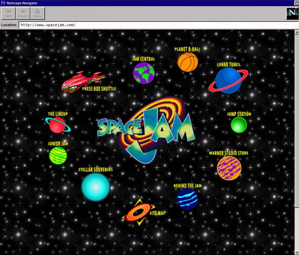 Il sito web utilizzato per promuovere il film Space Jam del 1996 includeva giochi, libri da colorare, quiz e persino un tour a 360 gradi del “Jordan Dome”. Un gruppo disordinato di cinque designer e produttori con sede a New York è stato incaricato di creare il sito web del film. La maggior parte dei dirigenti della sede centrale della Warner in California non capiva o non si preoccupava particolarmente di Internet, dando al team libero sfogo per sperimentare con poca supervisione. Inizialmente il team di cinque persone non conosceva l’HTML e per iniziare aveva acquistato il libro Teach Yourself Web Publishing with HTML in 14 Days.