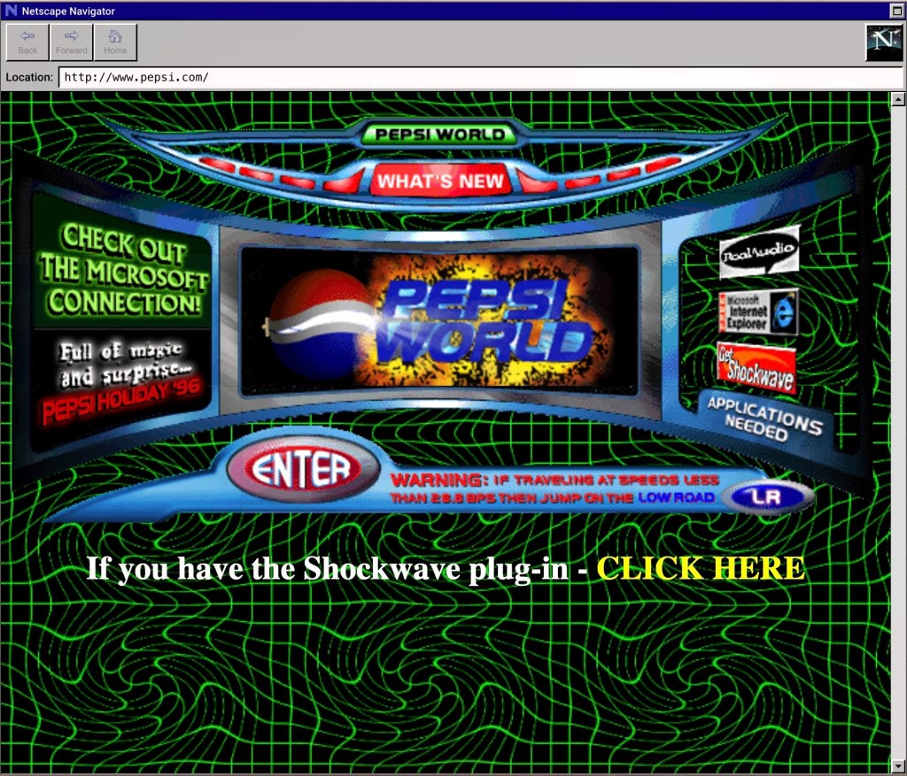 Nel 1996, Pepsi lanciò il suo primo sito web, “Pepsi World”, caratterizzato da un web design all’avanguardia per l’epoca. Il sito spiegava che l’obiettivo era “accendere il centro nevralgico della tua immaginazione a un livello mai sperimentato prima”. Il caotico sito presentava una serie di minigiochi Flash in una sezione intitolata “Lab Rats”. Inoltre, per qualche motivo, ha ospitato una sezione interamente dedicata all’astrologia e ha dedicato un’intera pagina alla promozione del nuovo album di Shaquille O’Neal, “You Can’t Stop The Reign”. (continua)
