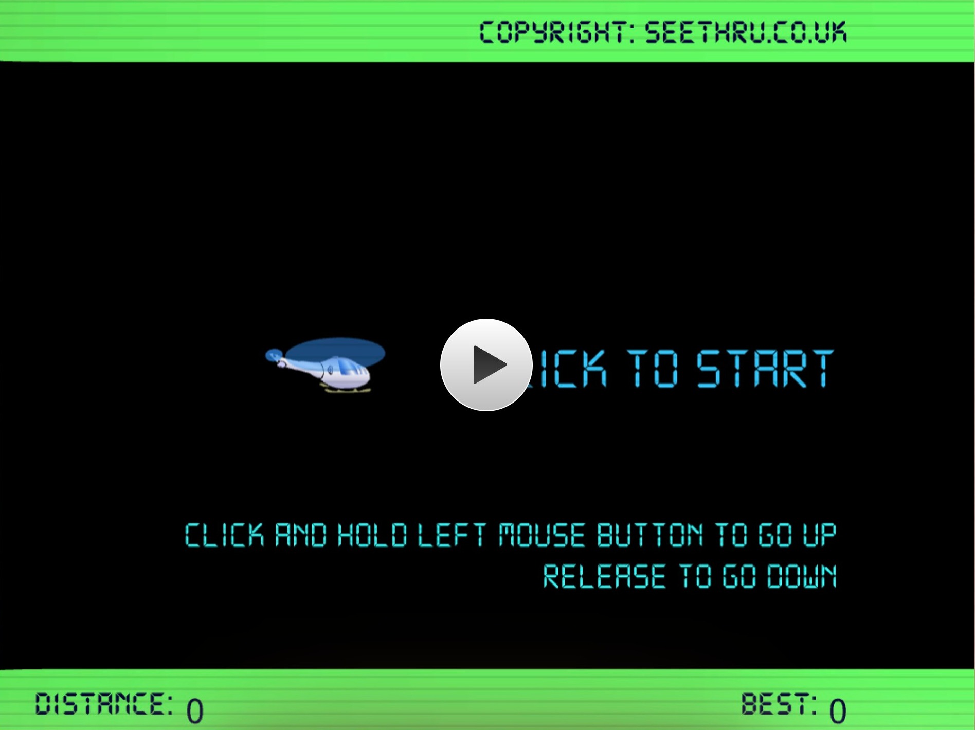 Progettato da David McCandless e pubblicato nel 2002, Helicopter Game è stato uno dei primi giochi flash avvincenti. Utilizzando un solo pulsante del mouse per salire, guiderai un elicottero attraverso un tunnel, schivando gli ostacoli lungo il percorso. È stato originariamente creato per Seethru.co.uk, un sito web che esisteva nell’universo immaginario della serie TV della BBC Allegati. Il sito era un blog immaginario sulla startup immaginaria “See Thru”. Lo spettacolo e il suo sito web corrispondente sono serviti come primi esempi di media interattivi “nell’universo”.
