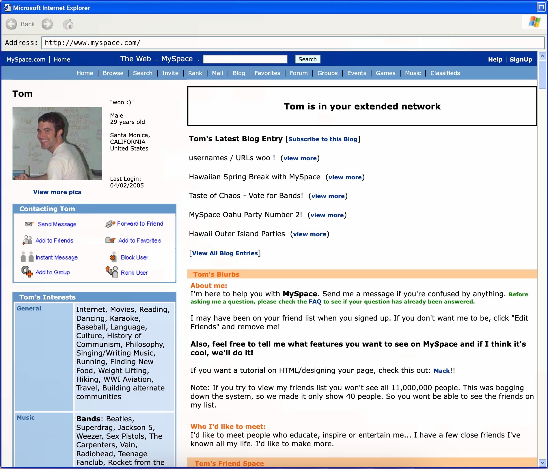 Nella primavera del 2003, Tom Anderson vide l’ascesa di piattaforme come Friendster e sentì che era un’occasione mancata per creare una piattaforma più creativa. Ha concepito MySpace come un luogo in cui gli utenti potevano esprimersi, consentendo anche HTML e CSS personalizzati sui profili degli utenti. La piattaforma ha guadagnato terreno per la prima volta nella scena musicale di Los Angeles, dove le band hanno utilizzato il sito per promuovere le loro canzoni. Man mano che il sito cresceva, iniziò a lanciare la carriera di band come i Panic! in discoteca. Tom è diventato lui stesso una celebrità, poiché era il primo amico predefinito di tutti su MySpace. A ottobre, la piattaforma aggiungeva 10.000 nuovi utenti al giorno.