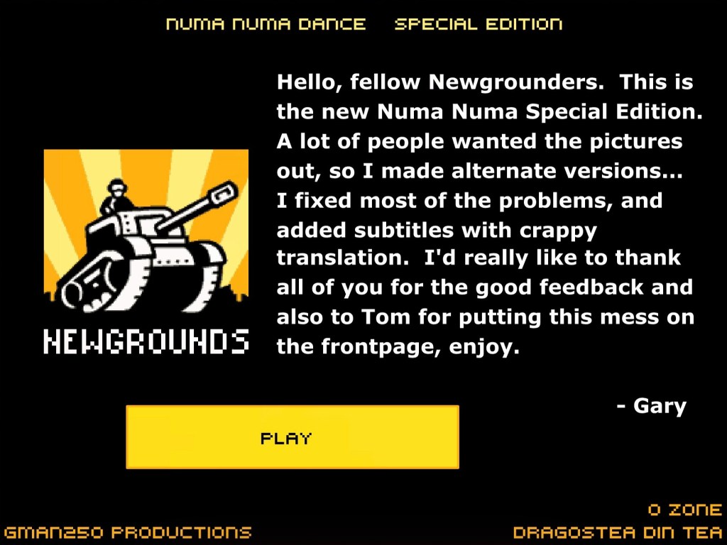 Nel dicembre 2004, il diciannovenne Gary Brolsma caricò un video webcam intitolato “Numa Numa”, in cui cantava in playback la canzone rumena “Dragostea Din Tei” degli O-Zone. Inizialmente ospitato su Newgrounds.com, Brolsma creò il video dopo aver guardato un cartone animato sui gatti giapponesi. Ancora prima dell’esistenza di YouTube, il suo video esplose una notte dopo che Newgrounds lo aveva messo in prima pagina. Un paio di giorni dopo, Brolsma si svegliò e trovò i furgoni dei notiziari di tutte le principali reti parcheggiati fuori casa sua, costringendolo a spiegare la sua improvvisa fama su Internet alla madre sorpresa.