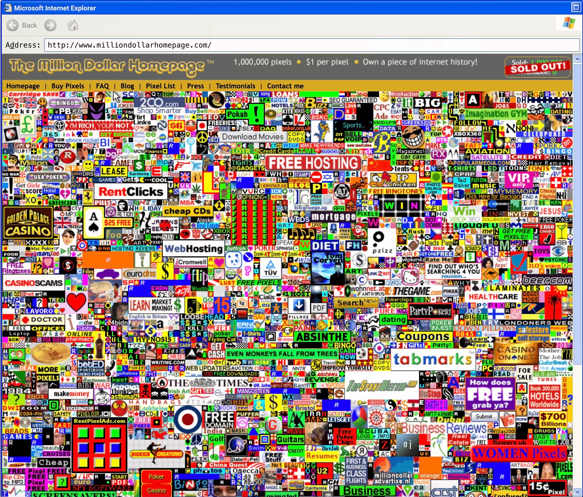 Nel 2005, Alex Tew, 21 anni, del Wiltshire, Inghilterra, ha ideato un modo unico per pagare l’università: The Million Dollar Homepage. Tew ha venduto 1.000.000 di pixel sulla pagina per 1 dollaro ciascuno o 100 dollari per un blocco di 10×10 pixel, trasformandoli in minuscoli cartelloni pubblicitari digitali per gli inserzionisti. Gli annunci spaziavano da fonti tradizionali come The Times of London a siti più di nicchia, come i casinò online. Il sito ha ricevuto 200.000 visitatori unici al giorno entro il primo mese. Gli ultimi 1.000 pixel sono stati venduti all’asta per 38.100 dollari, facendo guadagnare a Tew un totale di 1.037.100 dollari dalla trovata. Tew ha finito per abbandonare dopo il suo primo semestre, dicendo che la scuola non faceva per lui.