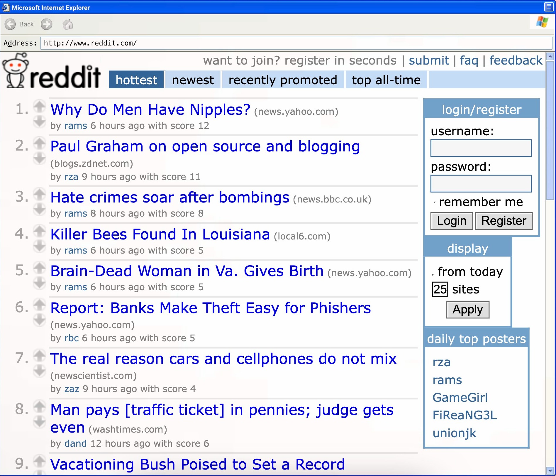 Nell’estate del 2005, due studenti universitari si unirono alla prima coorte di Y Combinator con 12.000 $ di capitale iniziale. Passarono dalla loro idea originale di un sistema di ordinazione di cibo tramite telefono per creare Reddit, concepito come la “prima pagina di Internet”. Il sito consisteva in un semplice elenco di link su cui gli utenti potevano votare, rendendolo un concorso di popolarità collaborativo. Inizialmente, i fondatori crearono post falsi sotto profili falsi per rendere la piattaforma più vivace. All’inizio, non c’erano subreddit e tutti i post erano mescolati insieme. Alla fine crearono il primo subreddit per separare i contenuti NSFW dalla pagina principale.