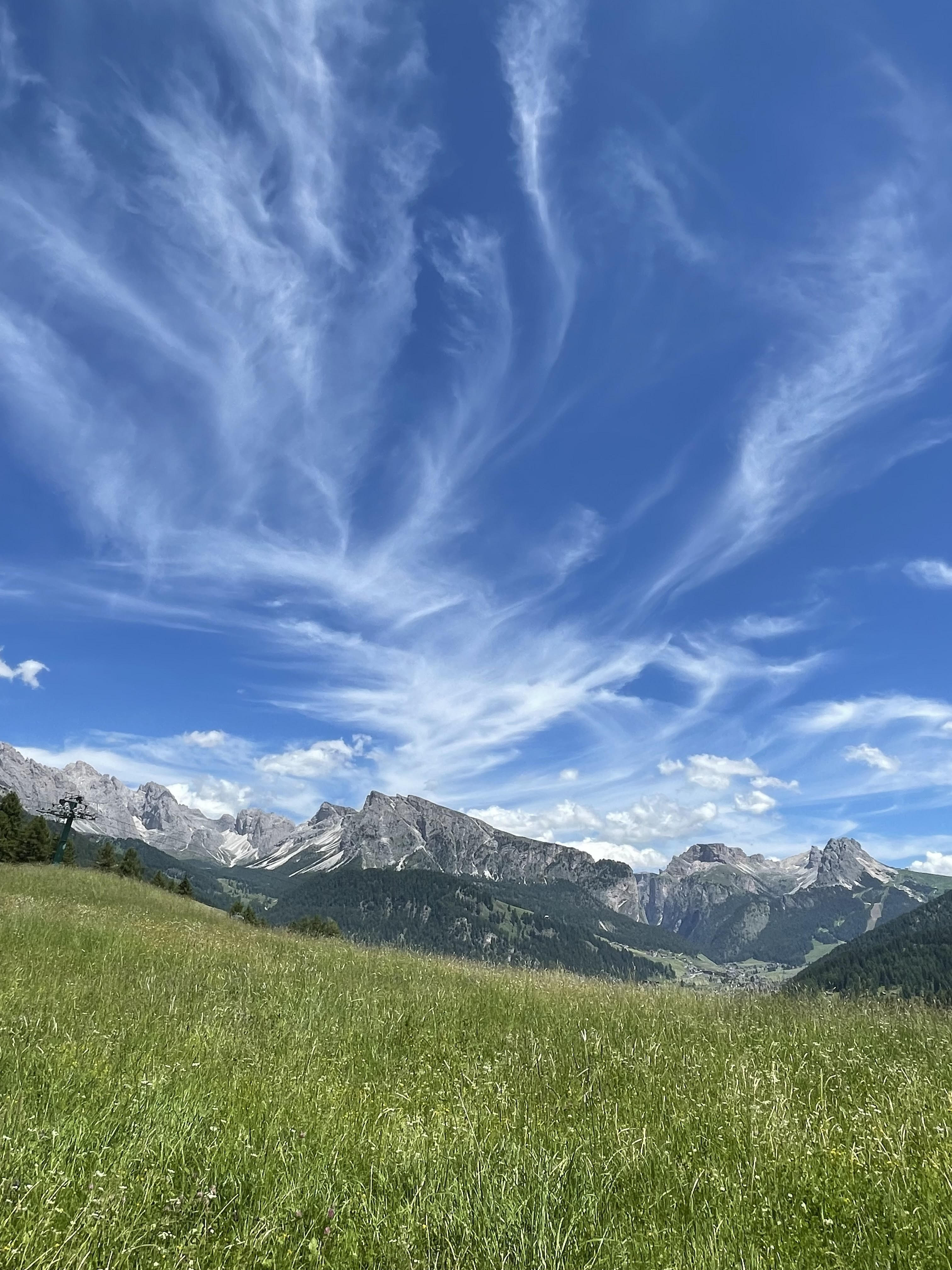 Nella seconda foto, siamo al centro della Valgardena ed esattamente a Santa Cristina, a nord c’è il monte Pic. La sua peculiarità sta nella generosità di regalarci dei panorami fantastici. A sud c’è questa visione, sempre presente, come fosse un faro che illumina la valle, il Sassolungo e al suo fianco il Sassopiatto.