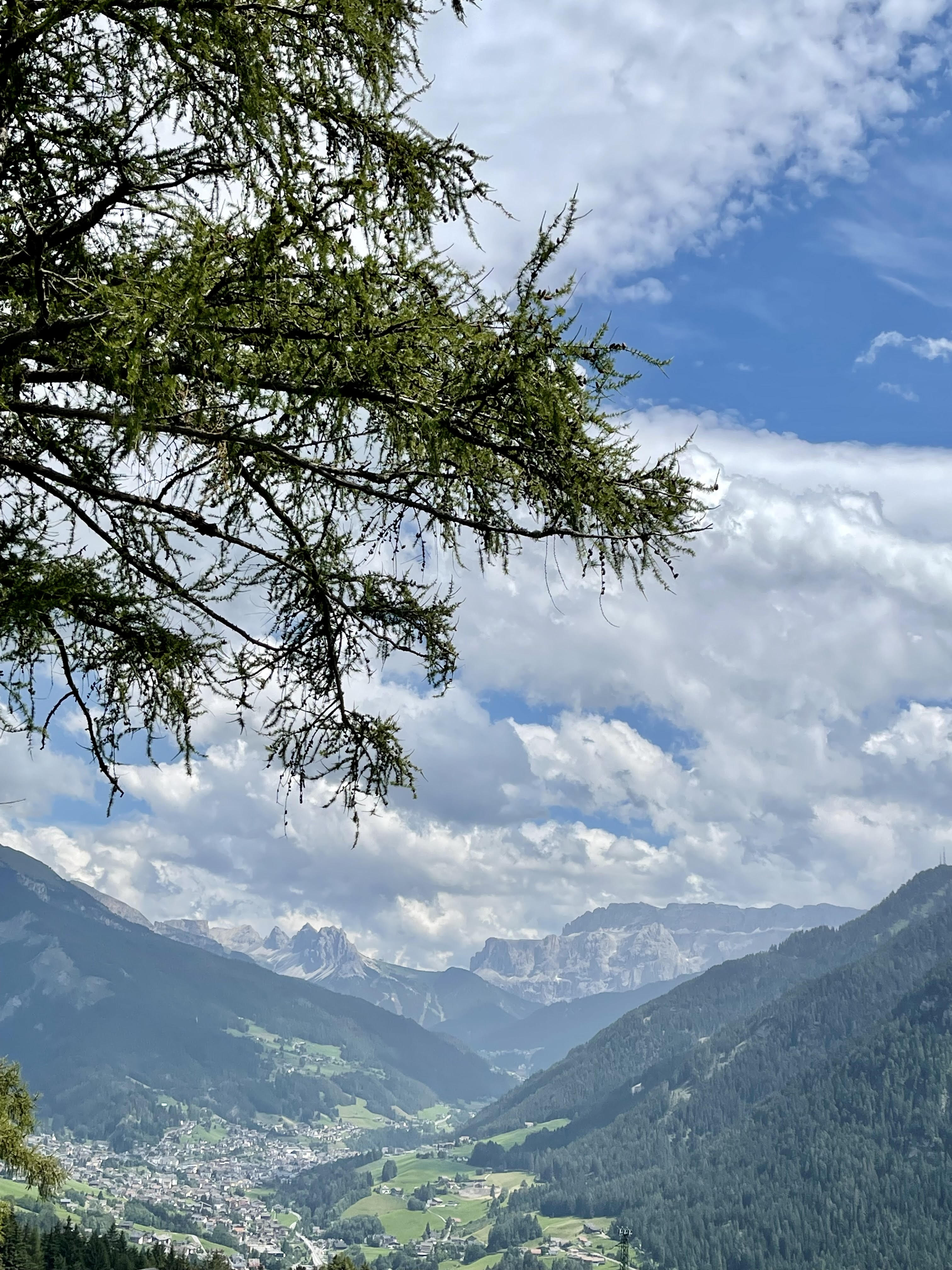 La prima (foto sopra) mostra l’inizio della Valgardena, da Ortisei verso il Gruppo del Sella. Il paesotto che si vede è Ortisei, il più “caotico” tra virgolette, nel senso che, essendo il più ricco come offerta turistica, nei mesi estivi i turisti certo non mancano. Forte anche della presenza dell’ovovia che porta ai 2000 metri all’Alpe di Siusi, uno dei posti più incantevoli delle dolomiti.